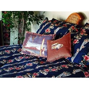 The classic look of this Hawaiian Island tradewind inspired design is perfect for anyone who lives, eats and sleeps the Hawaiian Islands. Catch a ride on this Hawaiian Tradewind Trolly to any island destination! Tonal Hibiscus flowers on a navy background with Woody cars and surfboards will guarantee Hawaiian dreams all night long. Machine washable. Queen / Full Duvets are 87" Wide x 87" Long; Button Enclosure. If you have any questions or concerns, please remember you can always email a Dean Miller Surf Bedding customer service representative online.