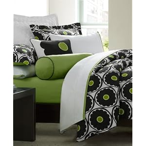 That 70's floral is so fun! Bring a pop of color and pattern into your room with this great Echo print bedding collection. The pop of green paired with the contrast of black and white is fun and eye catching. The comforter has hidden bartacks so you get a clean finish. face: T250 100% cotton print fabric; back:T250 100% cotton sateen fabric